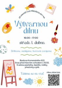 Má váš předškolák rád malování, stříhání a tvoření? Vyrazte k nám do školy! Čeká nás hodina plná výtvarných aktivit, při kterých si děti vyzkouší různé techniky a užijí si tvořivé odpoledne. Kdy: středa 1. dubna, 16:00 – 17:00 Kde: budova Komenského 622 (sraz v 15:55 před hlavním vchodem) Pro koho: předškoláci Důležité: dílnička je určena pouze pro děti a proběhne bez přítomnosti rodičů Co děti čeká: malování a práce s barvami stříhání a lepení tvoření z papíru a dalších materiálů prostor pro vlastní nápady a... Celý článek >>